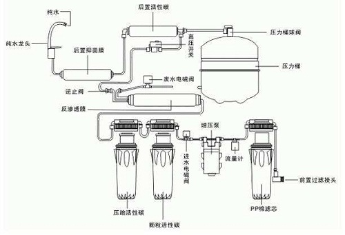 凈水器一般利用自來水管道壓力或自然壓力對水源進行凈化,純水機則需要較高的壓力,約在0.4-0.8MPa。這樣,純水機就需要使用增壓泵,提高反滲透膜的供水壓力。另外,純水機的產水流量都比較小,一般都需要使用儲水裝置,提前制造并儲存一定量的純水,方便用戶使用。